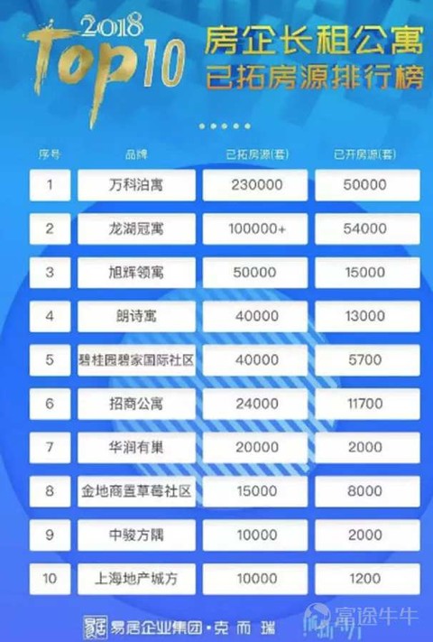 相比之下,由于资金和资源的限制,集中式公寓的规模扩张就慢得多,其已开房源排行榜中排名前三的是魔方公寓、世联红璞以及乐乎公寓,数量分别为7万间、3.5万间、3.05万间。